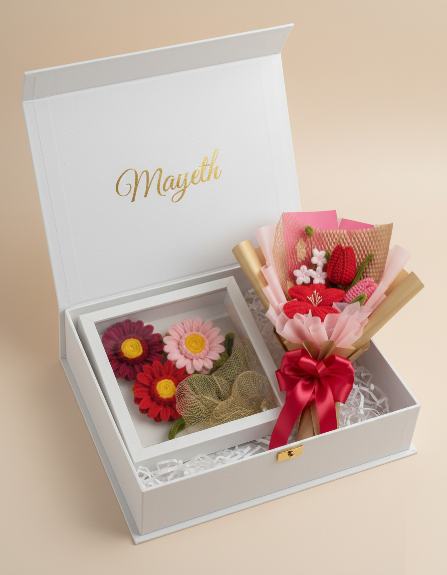 The Forever Yours Gift Set combines a Forever Yours Bouquet with a Bloom Frame, thoughtfully arranged to create a lasting impression. Each piece is handcrafted and curated to be displayed, treasured, and remembered long after the gift is given.